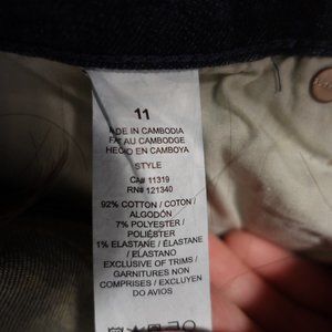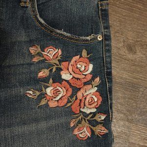 Ultra high rise ripped skinny jeans from Garage, size 11, medium wash, embroidered flowers, ripped knee, frayed bottom, stretchy denim