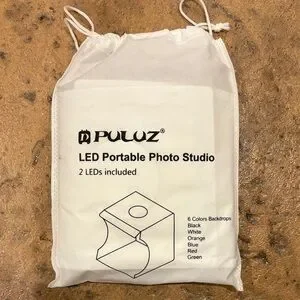 Compact and portable LED photo studio. Ideal for quick setup. Includes multiple backdrops for versatile shooting.