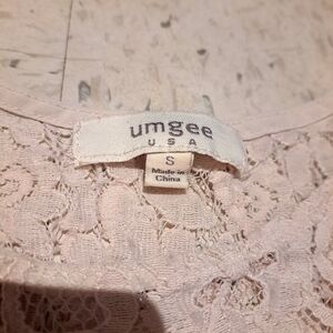 Umgee | Cream & navy blue patterned short front long back dress with lace details. has a silky fabric feel.