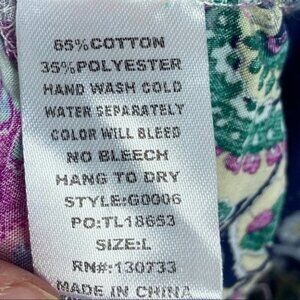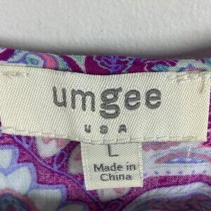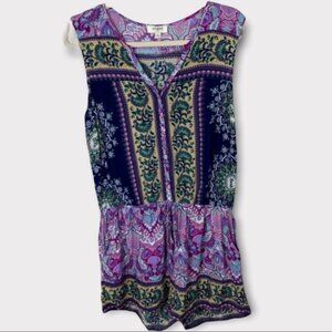 Umgee Playsuit in Jeweltone Print. Sleeveless Romper in Purple and Blue. Women's size large. Has pockets! Button down.Sleeveless. V-neck. 55% cotton and 35% poly. Style # G0006. Very good pre-loved condition. No flaws.