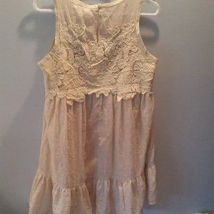 Umgee Kindred People sleevelss crochet top dress with ruffle hem. Bottom is lined. Button closure at back. Beautiful neutral tan colour. Size Small NWT