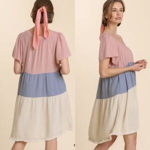 🆕 Umgee Linen Blend Colorblock Square Neckline Short Sleeve Dress Frayed Hem