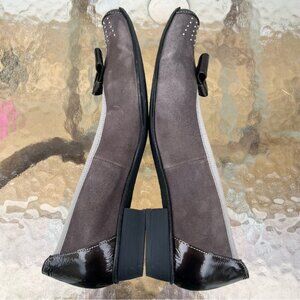 Un Tour En Ville Dark Grey Suede/Espresso Patent Leather Square Toe Slip On Shoe