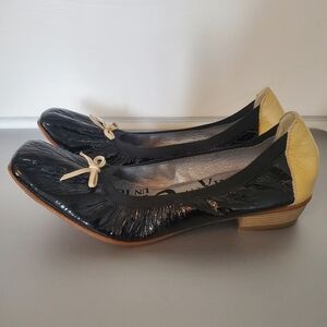 Inspired by the Paris fashion scene and made in France, these black and cream slip-on shoes by Un Tour En Ville (UTV) are effortlessly sophisticated. They feature a square toe with a sweet bow, a 1” (2.5cm) block heel, and rubber soles. The cushioned insoles and the elasticized tops that gently hug your feet make them comfortable for all day wear (they’re also ideal for travel). They are in very good condition.