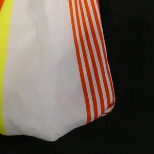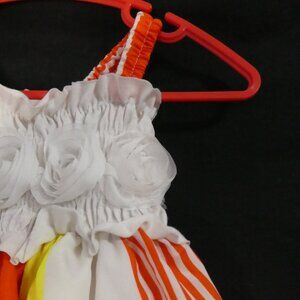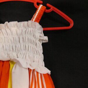 This delightful mini dress features a vibrant design with alternating panels of orange, yellow, and white, creating a playful striped pattern