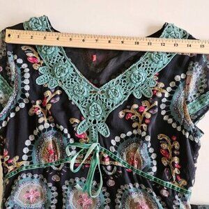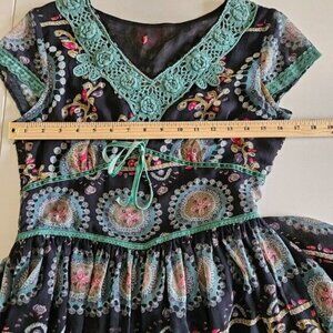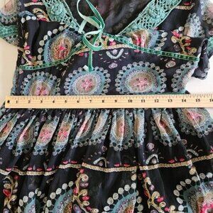 Unbranded (tag cut off) very bohemian vibe chiffon lined V neck with crocheted inset, lace sleeves and hem trim, velvet ribbon detailing dress