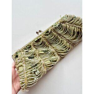 Unbranded Green Scalloped Beaded Sequin Embellished Satin Evening Purse Bag