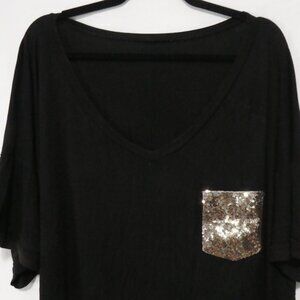 Elevate your casual style with this chic black top featuring a sparkling sequined pocket