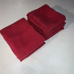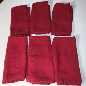 This set of six unbranded red table linens appears to be made from a woven fabric, possibly cotton or linen, with a slightly textured finish. Each piece is almost square and features a simple hemmed edge. When unfolded, the linens measure approximately 17 inches in length and 18 inches in width, as indicated by the ruler in the images. The items are pre-owned and show some signs of use, including minor creasing and slight variations in the fabric's texture. No tags.