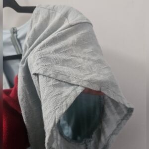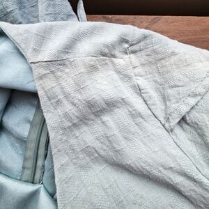 Another friends wedding casualty. Worn once and then saved. Beautiful vintage minty light green color. Very accommidating style, just wrap it tighter and wear a camisole underneath. No brand, no size, 2 small picks on the back hardly noticeable. Purchased from a consignment shop, dress is lined, has invisible zipper and short sleeves. Small amount of sun fading from store display on left shoulder again unless you are seeking it its hard to see. These small flaws are all photographed as well. Unknown fabric but it has a structure or stiffness to it. In fair used condition as I was the 2nd owner at least.
