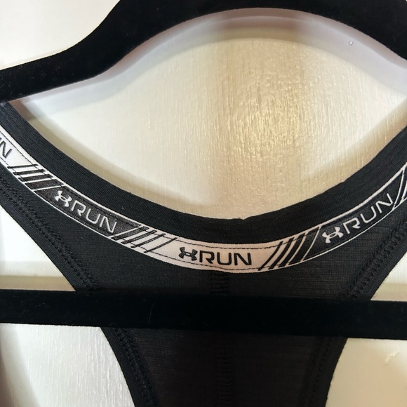 This Under Amour razorback tank is lightweight, breezy and perfect for any sort of athletic activity! The tank top is black with silver embellishments, and is slightly sheer. The size tag is missing, but it is a size large. This item is an excellent condition and has only been worn once.