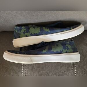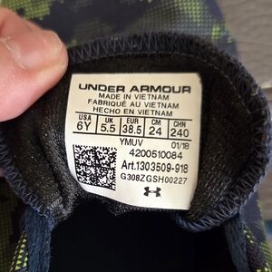 Stylish Under Armour sneakers with a camouflage pattern. Features a mix of green and blue with a white sole.