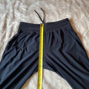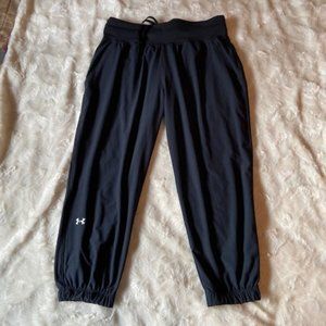Under Armour Heat Gear Black Capri Pants in very good pre-loved condition. Pants have 2 front pockets, draw cord inside waistband and elasticized at cuffs at the bottom. Size S. Super soft light weight material 89% polyester, 11% elastane. Machine washable. Colour depends on screen settings and lighting in pictures. All measurements are approximate and are taken with item laying flat and unstretched. All items are from my smoke free home.