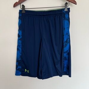 Experience peak performance with these Under Armour athletic shorts, featuring a dynamic blue color and lightweight material for optimal comfort during workouts. The elastic waistband ensures a secure fit, while the stylish design with contrasting blue camo-style panels adds a sporty flair.Size medium