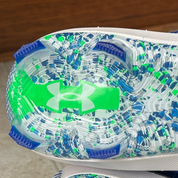 A new pair of Under Armour Bryce Harper 7 Low Baseball Cleats without a box. The forefoot cleats are metal and the cleats at the heel are TPU. The color is white/royal blue. Model 3025582-400. Men’s size 15.