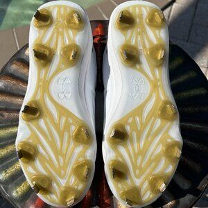 New pairs of women’s s Under Armour Glyde MT Softball Cleats with no box. Cleats are metal. The color is white and gold. Sizes 5.5 and 7.5 are available. Model 3024328-103.