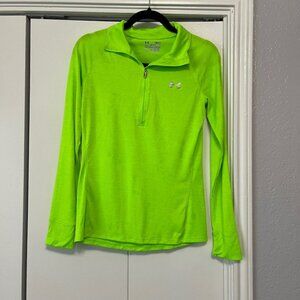 Keywords: Under Armour, half zip pullover, athletic top, AllSeasonGear, neon green, running shirt, workout top, women's activewear, performance apparel, long sleeve, semi-fitted, UA, training top, gym wear