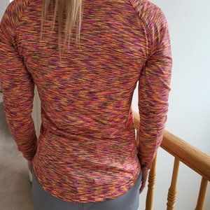 Gorgeous bright mixed colours, super lightweight, excellent layer. Form fitting. I cut label out at neck because it was bothering me. Worn 2-3 times.