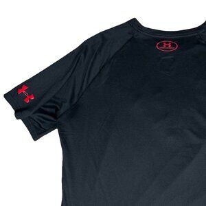 Features iconic Superman "S" shield logo. German release performance heatgear graphic tee from Under Armour. Designed for comfort and moisture-wicking. This tee is perfect for workouts or casual wear, offering both style and functionality. The comfortable fabric keeps you dry and cool, making it ideal for active lifestyles.