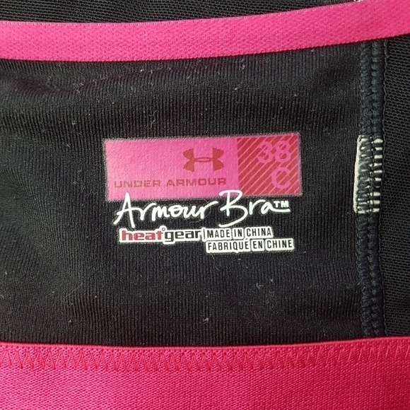 Under Armour high compression heat gear sports bra with padded cups. Sz 38C. Elastic at the shoulders. Adjustable hook closures. Removable pads. A little pilling in the lining. Smoke free home.