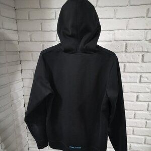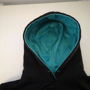 Size large Black with teal color lined hood & logo on front Drawstring hood Kangaroo pocket Ribbed cuffs & bottom Loose fit Fleece lined Body - 100% Polyester Rib - 92% Polyester / 8% Elastane Hood Lining - 1009% Polyester Back Neck - 100% Polyester Great used condition - one of the hood ties is twisted