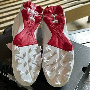 A new pair of men’s size 8 Under Armour Leadoff Low RM 3.0 Baseball Cleats. They are White and Red. The cleats are molded rubber. Product code is 3027447-600. They were tried on but never used.