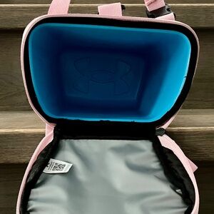 Under Armour light pink lunch bag. Fabric outer shell, rigid blue plastic inner compartment to keep your meal items from getting crushed. This lunch bag will keep your items cold/warm as it is also insulated.