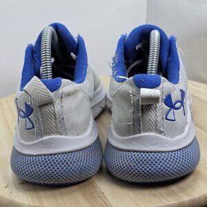 The Under Armour Men's Hovr Turbulence 3025419-100 White Running Shoes in size 8 are designed for comfort and breathability, making them ideal for casual wear. These sneakers feature a lace-up closure, low-top shoe shaft style, and rubber outsole for durability. With a solid white color and sports theme, they are suitable for all seasons and activities like running and jogging. The synthetic upper material and standard shoe width ensure a good fit for most men, while the Under Armour HOVR product line guarantees quality and performance. The heels of the shoes have some tears but the shoes look great from the outside.