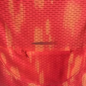 Got it as a gift from my husband, but never worn as I do not workout outside. Beautiful colour, mesh sides and back. There is a cellphone pocket in the back as well. 16 inches across chest, 25 inches long (length varies as it is longer in the front and back and shorter in the sides).