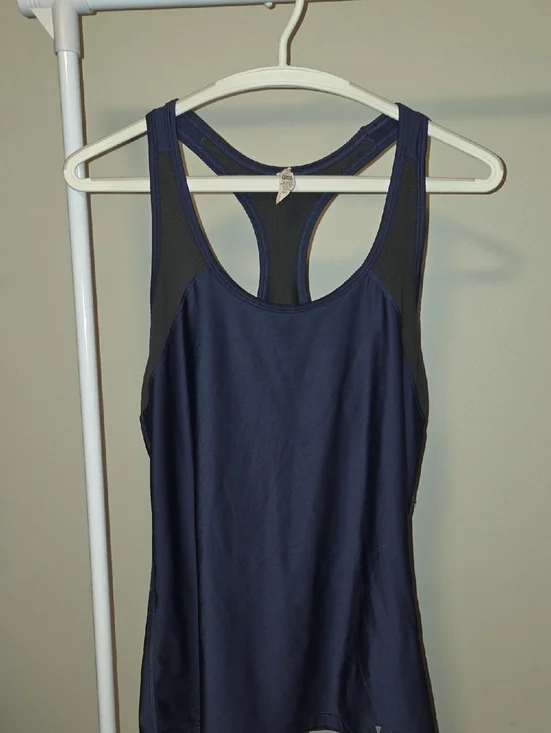 Lightweight navy tank with breathable mesh racerback. Stretch fabric for full range of motion. Sleek athletic design for workouts or layering.