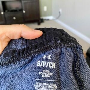 Black with grey camo pattern, these Underarmor Project Rock shorts are super comfy with an elastic waistband and adjustable string. There are two front pockets, and while there are no tags, the shorts were worn. Smoke free, pet free home.