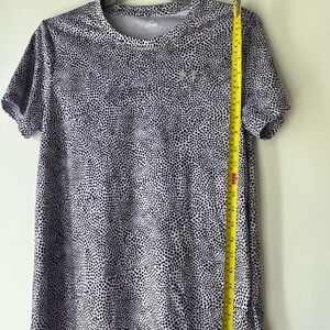 Under Armour, activewear, workout top, gym shirt, performance tee, running shirt, athletic shirt, sporty, breathable, quick dry, moisture wicking, loose fit, size small, black and white, abstract print, polka dot pattern, minimalist, lightweight, women’s athletic wear