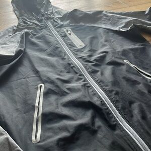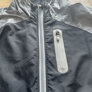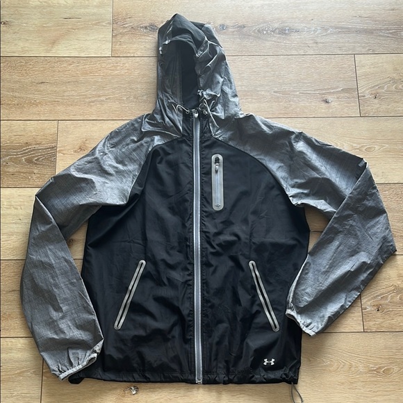 Two tone under armour shell jacket. Very thin. NOT water proof. Cinch-able waist. Side pockets don’t have zippers but chest pocket does! Excellent condition