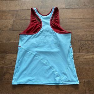 - Baby blue and burgundy athletic tank top with built in shelf bra