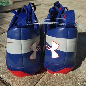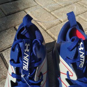 A new pair of Under Armour Team Nitro Low MC N Football Cleats in size 15. They are brand new and have never been worn. There are no tags attached. Does not include the box. Model 1287491-019. Colour pattern is Grey, Blue and Red.