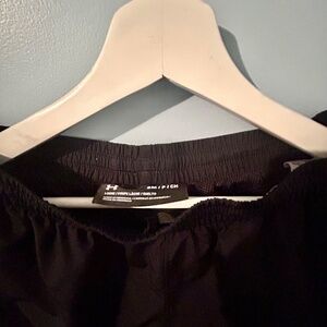 Black, loose fit. Runs Small. Tighter at Thighs/Waist. Great for working out. Polyester.