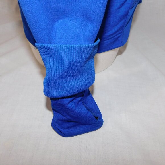 This Womens Small Under Armour Semi Fitted Cold Gear Royal Blue Hooded Full Zip Jacket is in great clean condition. Jacket is shell is 100% Polyester - Lining 87% Polyester - 13% Elastane. mid weight perfect for spring and fall cooler days . Features 2 side hand pockets . 2 Layer cuff with internal cuff layer with thumb Hole. Perfect for keeping hands warm when doing outside activities running - hiking ect . Reflective Under armour logo on from hem and reflective UNDER ARMOUR on back lower back .