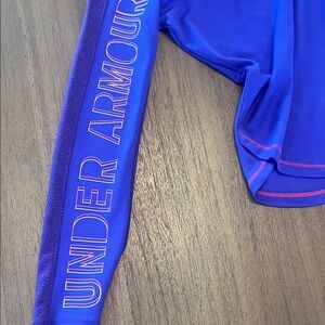 Stylish kids matching set. Includes purple long-sleeve top with zipper. Black leggings with purple and pink accents. Comfortable and sporty.