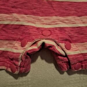 Under Armour girls 6-9 months pink and white striped romper, snaps on the shoulder and inseam, screen printed, has manufacturer printing defects pictured, 100% cotton