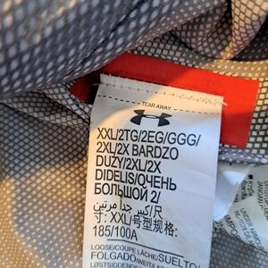 Under Armour men's size 2XL 2 Tone Storm 3 jacket, orange & maroon, it had a couple of small marks, pictured, seams are heat sealed, hood is attached, all zippers in good working order, cuffs have hook n loop to adjust size, side vent zippers, VGUC