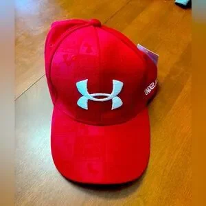Vibrant red hat with bold Under Armour logo. Perfect for active kids.
