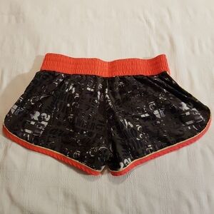 EUC Under Armour ladies medium shorts with liners, the band and the trim are brighter flourescent orange than pictured, the base color is dark green, the lettering is black through grey shades, silky fabric, no defects I see