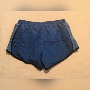 Under Armour women's size Medium shorts with liners, 2 tone blue, inside drawstring, tiny triangle design, VGUC