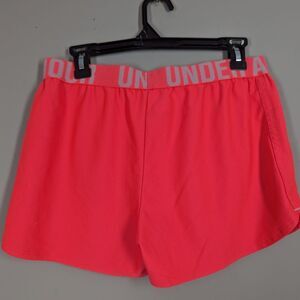 Bright and sporty Under Armour athletic shorts in a vibrant pink shade. Features a bold elastic logo waistband, drawstring tie, and reflective logo at the hem. Designed with a 3" inseam for easy movement, lightweight performance fabric, and built-in liner for comfort. Perfect for running, gym sessions, or casual wear.