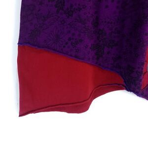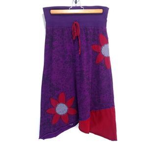 Lovely purple floral a-line skirt from Underground Original with big red flower patches and an asymetric pixie cut hem. 100% Cotton. Excellent preloved condition no stains or tears. Tall elastic waistband which you can roll down to make it shorter, I just have it unrolled for hanging. Drawstring ties for adjusting tightness at hip or waist. Size M.