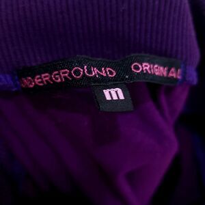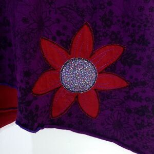 Lovely purple floral a-line skirt from Underground Original with big red flower patches and an asymetric pixie cut hem. 100% Cotton. Excellent preloved condition no stains or tears. Tall elastic waistband which you can roll down to make it shorter, I just have it unrolled for hanging. Drawstring ties for adjusting tightness at hip or waist. Size M.