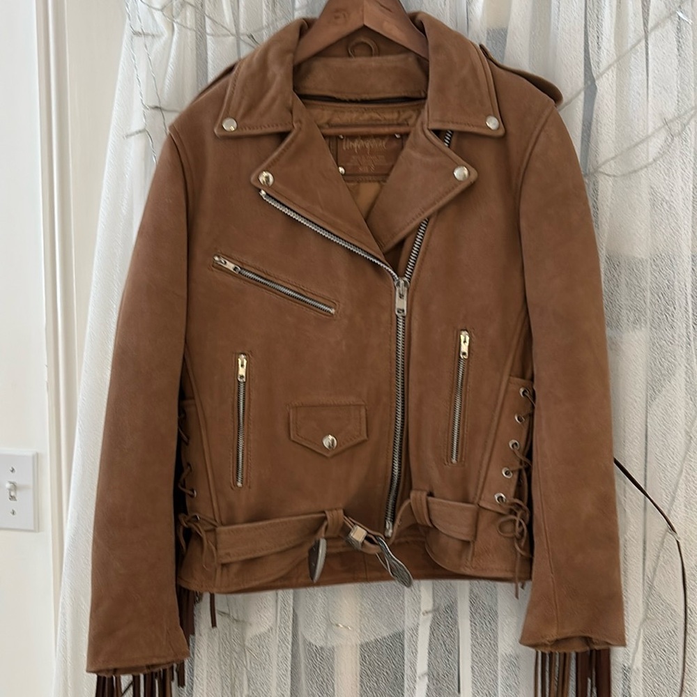 Understated leather fringe jacket. 100% genuine leather. Size small. Made in Texas USA. Tan leather suede and leather combo. detachable internal quilting to add warm during winter or cooler months. Silver hardware. Very well made jacket. Never ever been worn. A staple one of a kind piece.