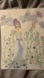 Stylized clouds with oversized butterflies happily loom above the pretty lady out in her garden which, interestingly, grows out of her dress as well as in behind her.