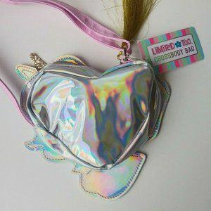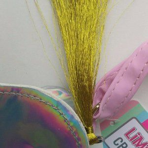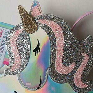 Sparkly UNICORN Crossbag in silver and pink. Adorable unicorn is featured on the front. Sparkly glitter adds flare that all girls will love! Bag is 7 inches wide by 7.5 inches high. Perfect size, not too big and big enough to hold necessary items.
