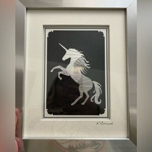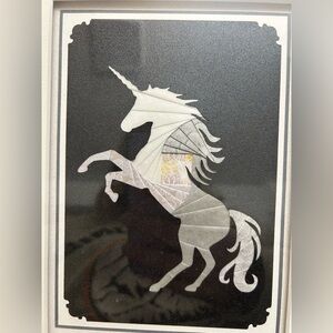Really beautiful paper folding art piece of a unicorn by artist Karen Bernard from the Ottawa Valley area. Work is original and signed by artist. She sells her works on Etsy. Work comes framed in silver and is in excellent condition. Was in my daughter’s room and this was a beautiful piece or decor, but she’s grown out of her unicorn phase.
